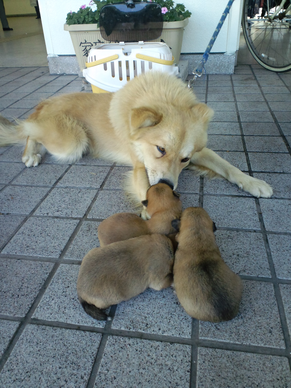お父さんであるベンケイさんは子犬ちゃんのそばで